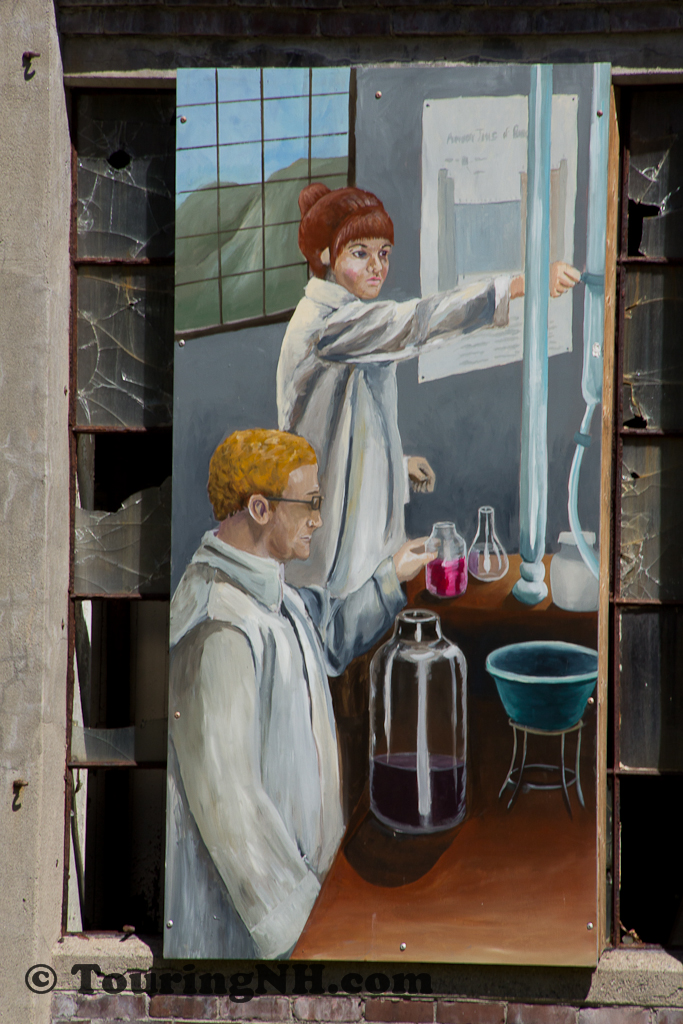These were used to help the different logging companies keeps their log booms separate during the annual run to the mills. A wonderful collection of murals was painted on 4X8 sheets of plywood, by students from the College of Arts and Sciences, and placed in the broken out windows of the Brown Company’s Research and Development building. These murals represent Berlin’s history. This building now houses a museum…