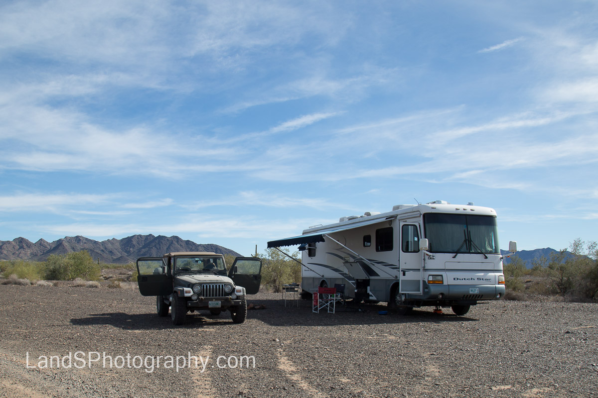 Once we reached the Bureau of Land Management land in Quartzsite, we set about finding an area to boondock in for the next several weeks. Boondocking is living in your motorhome or RV without hookups for water, sewer or electricity. Waldo has a 100 gallon water tank, a propane fridge and a generator. The biggest challenge is the sewer. The gray tank which holds shower and sink water fills up pretty quickly. The black tank which holds the actual sewer fill up a bit slower. When the tanks get near full or we get low on water, we drive into town and “dump” and refill. This is our home for the next 6-8 weeks…