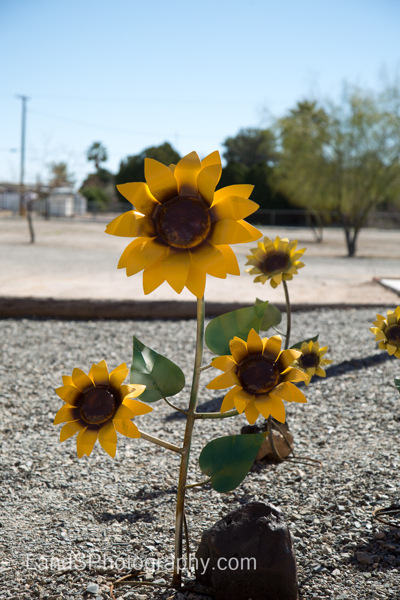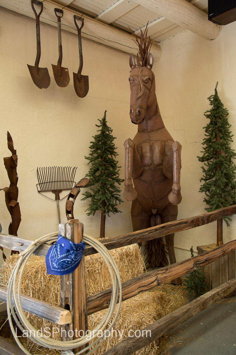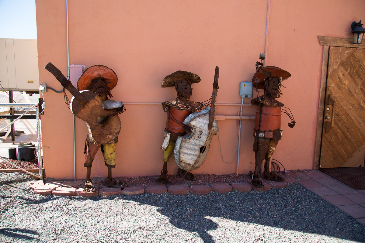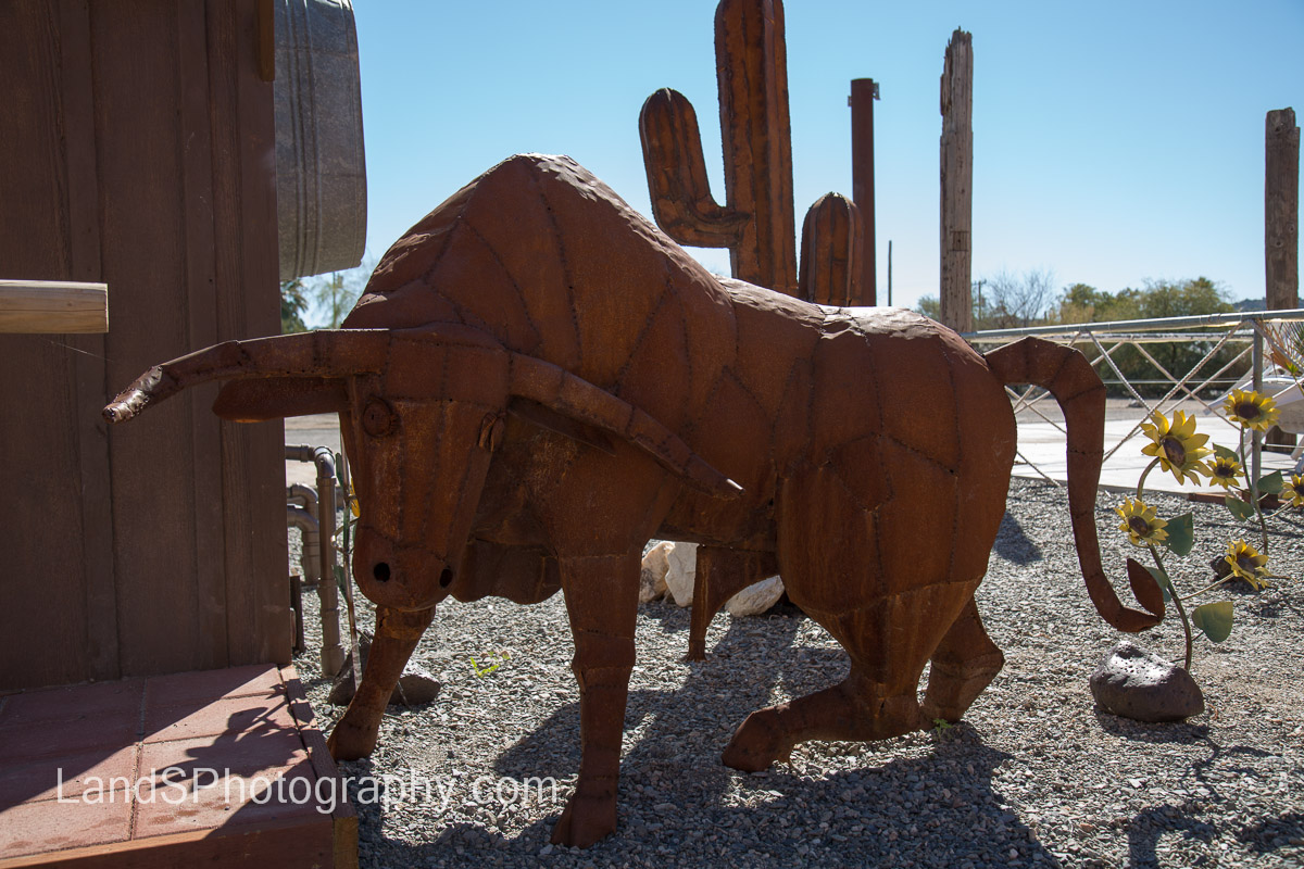 It was getting on towards noon and the pangs of hunger were setting in. There are no “drive-thru” restaurants for miles and miles and we had two dogs with us, so going in somewhere was out of the question. We lucked into finding the Iron Horse Bar and Grill at the Desert Gem RV Park in Salome. Daddy stayed in Toad with the dogs while I went in to order us some lunch to go. The owner saw me taking pictures and said there was more to see if I went with him. Never one to pass up an opportunity for images, I gladly followed him out back. The first thing I saw was an outdoor eating area, complete with picnic tables and a tent for shade. I asked if we could sit there with the dogs and enjoy our lunch, to which he replied “SURE!!” Then I followed him into their function hall. He told me about seating and live music, I barely heard him as I marveled at the decor…