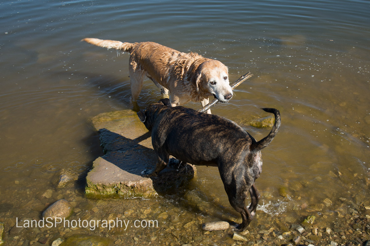 Because there has been so little rain this year, two of the three boat launches are closed. We found the third and let the dogs out to swim and play…