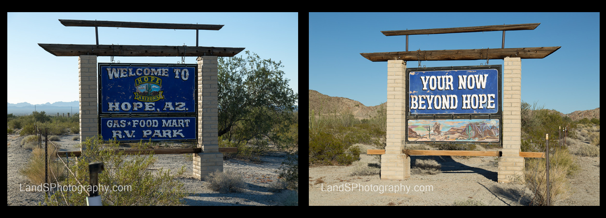 We drove through the tine town of Hope, AZ. We saw the sign welcoming us and two minutes later, we saw the sign letting us know we had passed through…