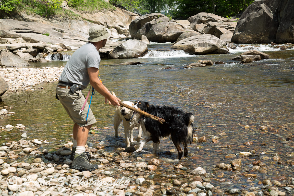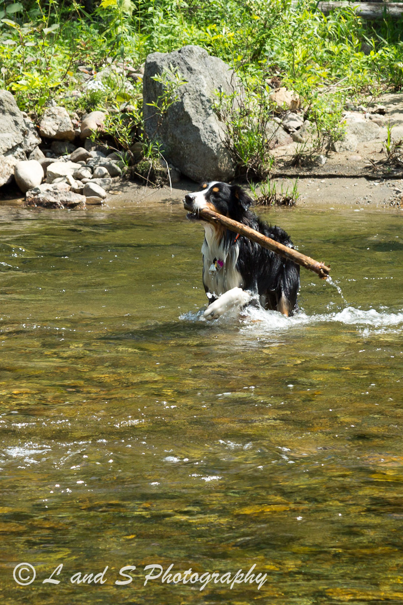 After I took my pictures, I kicked off my shoes and walked along the rivers edge. The cool water brought some welcome relief from the heat of the day. I was just getting ready to pack up when a young man and his canine companions stopped by for a little afternoon game of fetch…