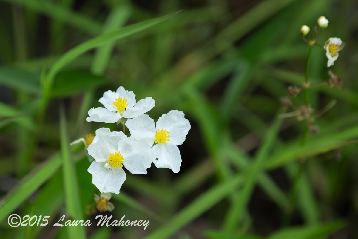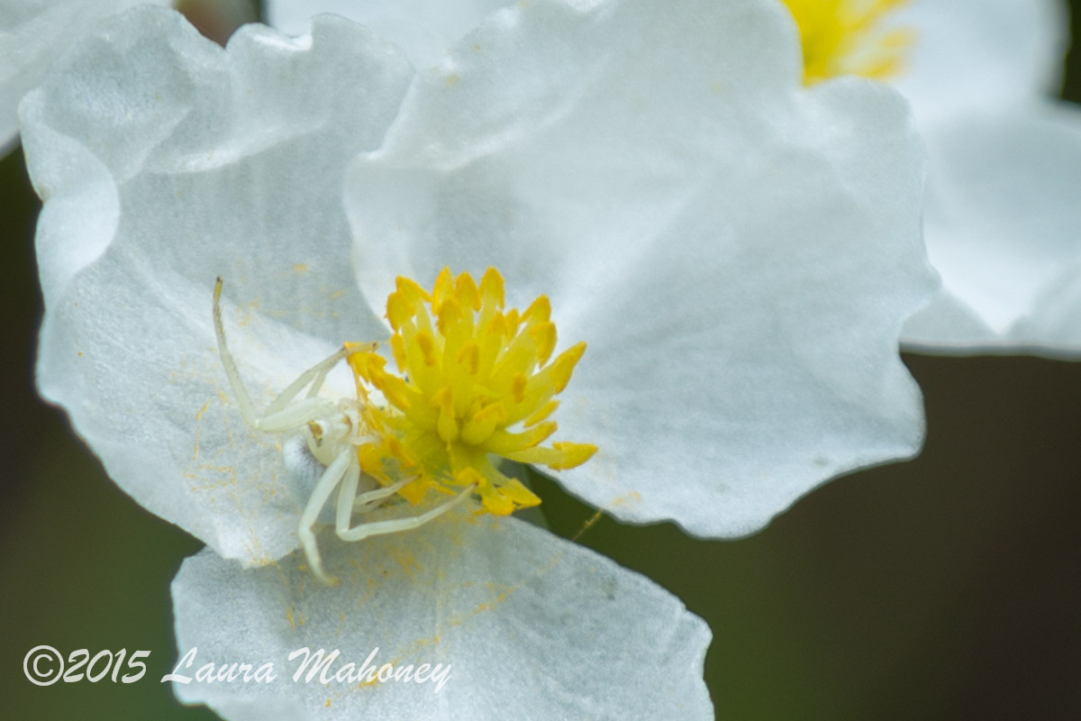 When I first saw the broadleaf arrowhead flowers I thought, “My, how pretty.” It wasn’t until I went in for a close-up that I saw the white orb weaver spider…